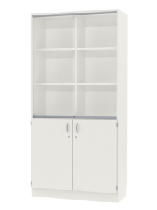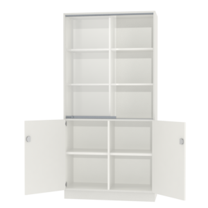 4-door with center panel. 2 hinged doors 2 FH at the bottom, individually lockable on both sides. 3 FH sliding glass doors (safety glass) at the top.