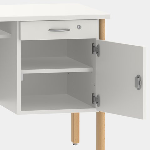 - Base cabinet includes drawer and one shelf behind hinged door, lockable by means of security lock