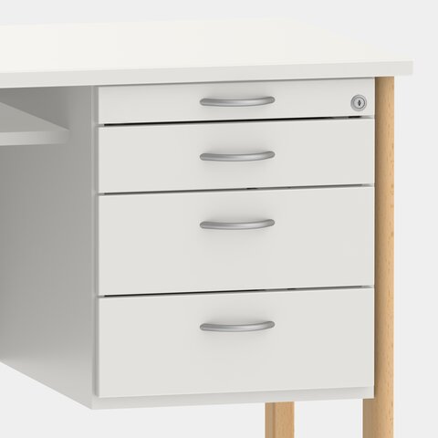 Base unit, 3-sided panel with shelf and lockable bottom cabinet includes pencil drawer 1 U, 1 drawer 2 U and 2 drawers 3 U: 3-layer chipboard (E1), melamine coated, with 1 mm and 2 mm plastic edge, thickness: 19 mm. Drawers with central locking and soft-closing mechanism.