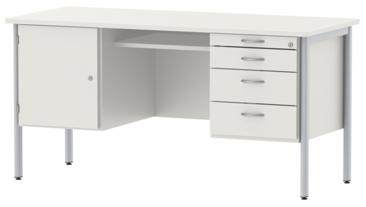 Base unit, 3-sided panel with shelf and two lockable base units on left and right. Left base unit includes 1 shelf behind hinged door, right base unit includes pencil drawer 1 U, 1 drawer 2 U and 2 drawers 3 U: 3-layer chipboard (E1), melamine coated, with 1 mm and 2 mm plastic edge, thickness: 19 mm. Hinged door with safety lock, drawers with central locking and soft closing mechanism.