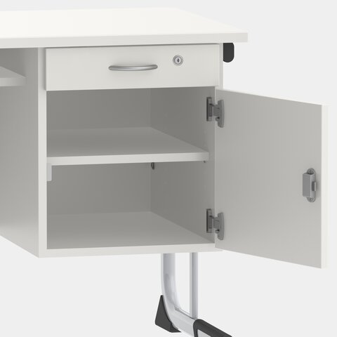 - Base cabinet includes drawer and one shelf behind hinged door, lockable by means of security lock