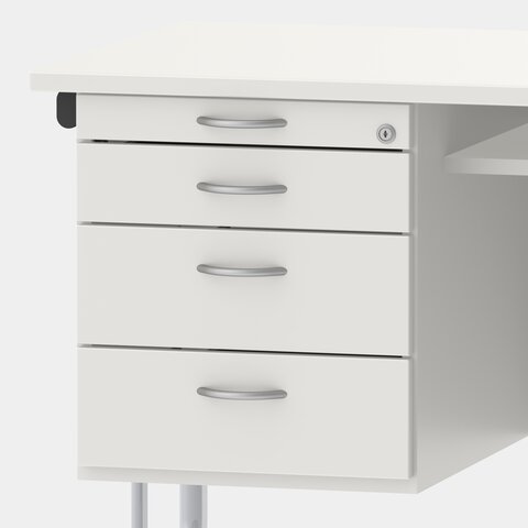Base unit, 3-sided panel with shelf and lockable bottom cabinet includes pencil drawer 1 U, 1 drawer 2 U and 2 drawers 3 U: 3-layer chipboard (E1), melamine coated, with 1 mm and 2 mm plastic edge, thickness: 19 mm. Drawers with central locking and soft-closing mechanism.