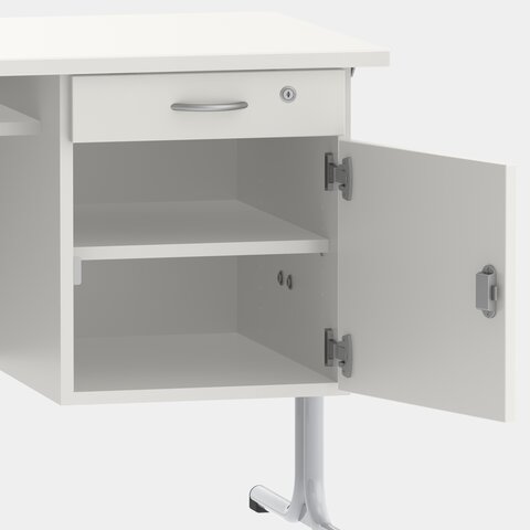 - Base cabinet includes drawer and one shelf behind hinged door, lockable by means of security lock