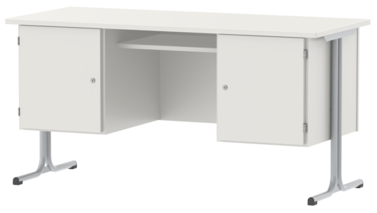 Base unit, 3-sided panel with shelf and two lockable lower cabinets, each includes 1 shelf behind hinged door: 3-layer chipboard (E1), melamine coated, with 1 mm and 2 mm plastic edging, thickness: 19 mm. Revolving door with safety lock.