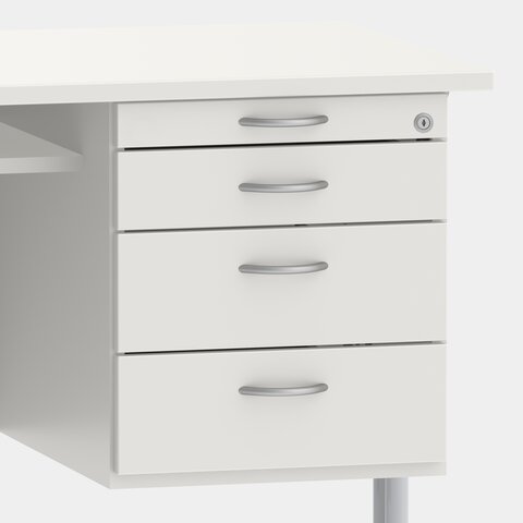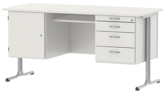 Base unit, 3-sided panel with shelf and two lockable base units on left and right. Left base unit includes 1 shelf behind hinged door, right base unit includes pencil drawer 1 U, 1 drawer 2 U and 2 drawers 3 U: 3-layer chipboard (E1), melamine coated, with 1 mm and 2 mm plastic edge, thickness: 19 mm. Hinged door with safety lock, drawers with central locking and soft closing mechanism.