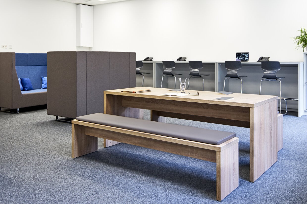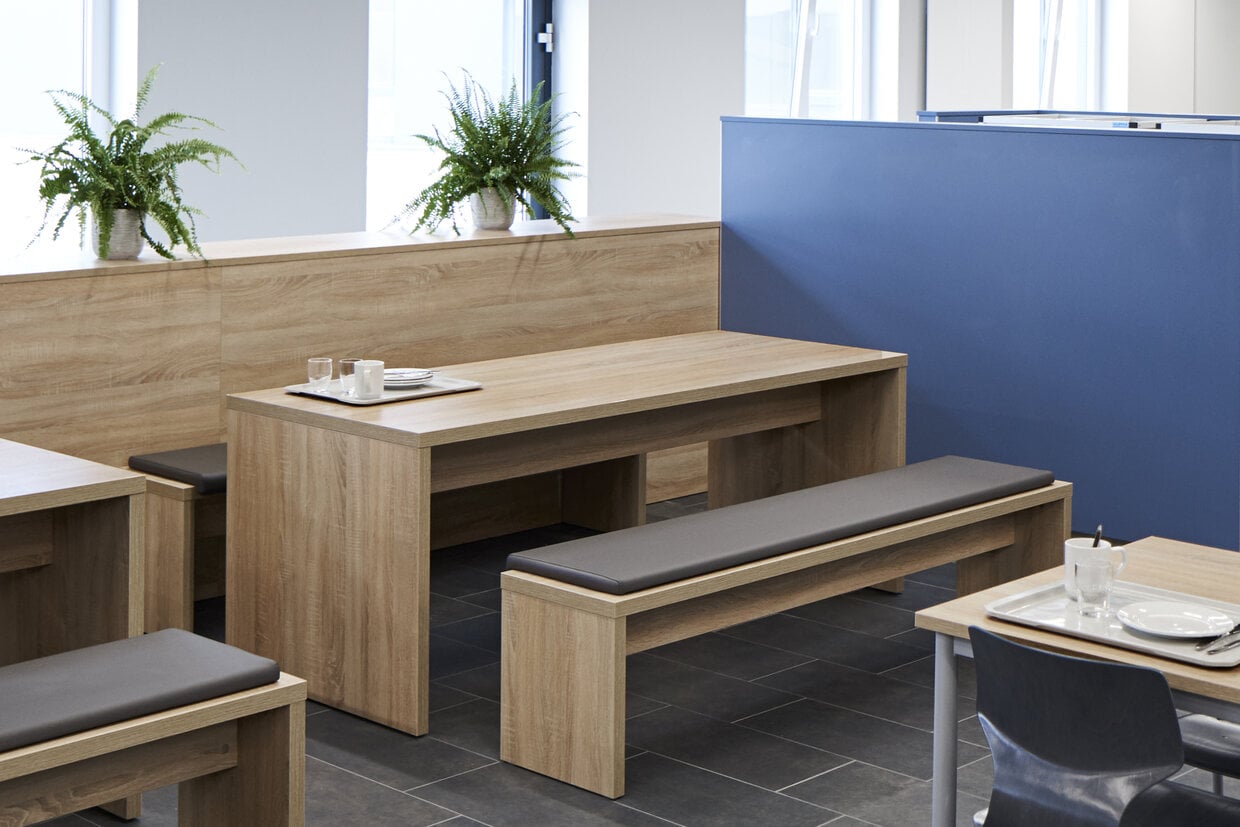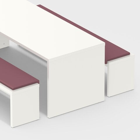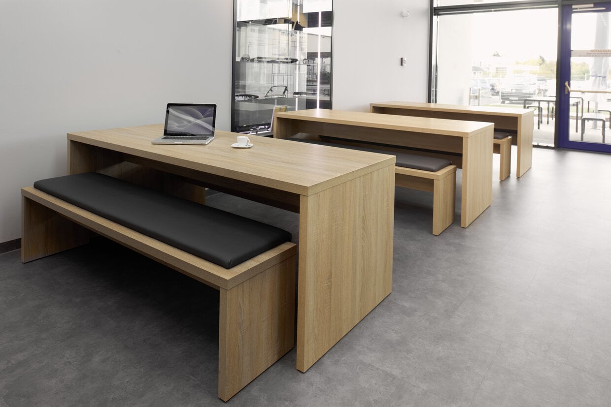 The bridge table has a cheek design and is extremely hard-wearing and robust thanks to its 38 mm thick multiplex tops with a highly abrasion-resistant melamine resin coating. Together with the matching SOLID benches, the tables can be combined to form a practical seating group.