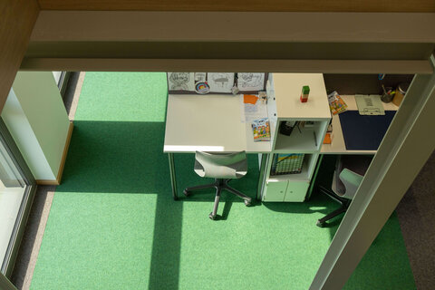 Das Ergebnis sind die sogenannten Lerninseln, die vier Lernplätze bieten. Eine Lerninsel besteht aus zwei Tischen, mit jeweils einem Schülerstuhl an der kurzen Kante und einer kleinen Trennwand in der Mitte – ähnlich wie bei einer Tischtennisplatte. An ihren langen Seiten sind die Tische über ein schmales Schrankmodul miteinander verbunden.