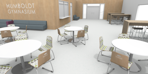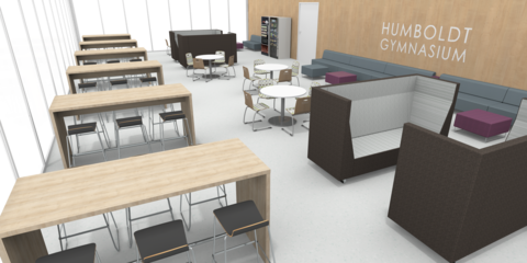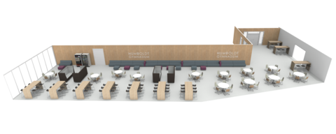 Diese Cafeteria einer Schule mit Ganztagsbetreuung ist direkt an eine Mensa angeschlossen. Zwei Snacktheken – mit und ohne Bedienung – stellen kurze Wege sicher und helfen, auch zu Stoßzeiten Warteschlangen zu vermeiden.