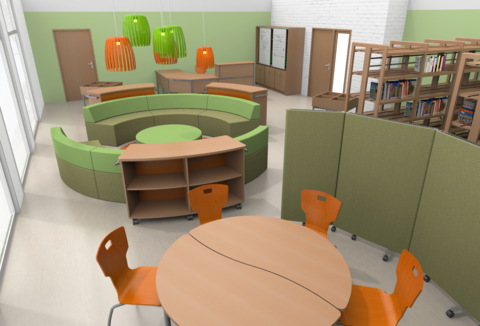 Der Raum, der stets unter Aufsicht genutzt wird, beinhaltet neben Bibliothek und Mediathek auch mehrere Möglichkeiten zur Gruppenarbeit und zum Austausch.