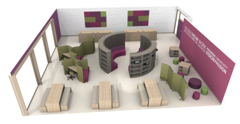 Das Außergewöhnliche an diesem Raum ist das große Rondell, dessen Außenseite als Bibliothek fungiert und neben Regalflächen auch Einzelarbeitsplätze bietet. Sein Innenbereich ist akustisch ausgestattet und bietet Lernenden eine geschützte Rückzugsmöglichkeit zum Lesen und Entspannen. Aufgrund der Größe kann der Innenbereich auch gut für Präsentationen und Diskussionen ganzer Lerngruppen genutzt werden.