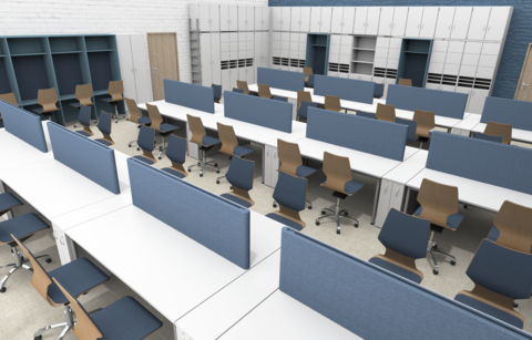 Dass sich alles, was ein großes Kollegium braucht, raffiniert in einem einzigen Raum unterbringen lässt, heißt nicht, dass es auch immer so sein muss. Dieses Einrichtungskonzept umfasst 3 miteinander verbundene Räume für die unterschiedlichen Bedürfnisse.