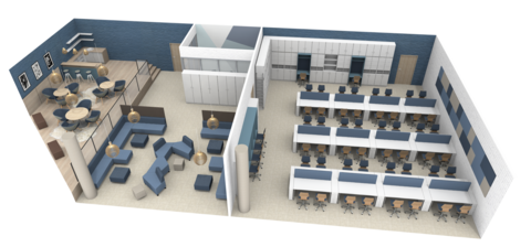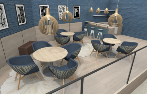 Der Snackbereich in der Anmutung einer Kaffeebar lädt dazu ein, sich in Pausen komplett aus dem Arbeitsbereich zurückzuziehen. Auch der großzügige Loungebereich erlaubt Entspannungsmomente ohne Gedanken an den Stundenplan.