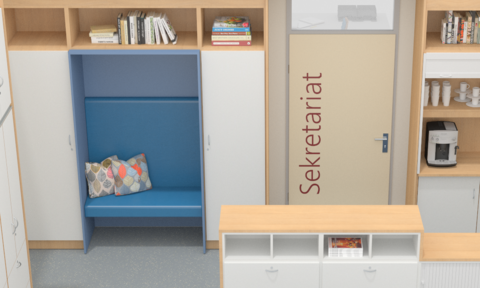 Dabei hilft u. a. der Empfangstresen, der Besucher:innen zu tiefe Einblicke verwehrt und die in die Schrankwand integrierte Sitznische, welche als kleiner, diskreter Wartebereich dient.