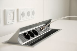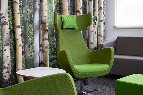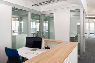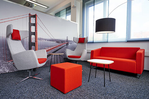 Die Einrichtung wurde individuell nach Kundenwunsch konzipiert. Helle, funktionale Büros mit neuester technischer Ausstattung ermöglichen ein ruhiges, konzentriertes Arbeiten – z. B. im Sitzen oder Stehen an den höhenverstellbaren Schreibtischen. Im Kontrast dazu schaffen die lebhaft gestalteten Küchen und Kreativbereiche eine inspirierende Wohlfühlatmosphäre. Das fördert die Kreativität und regt nicht nur in den Pausen zum Austausch an.