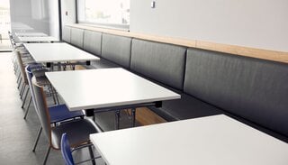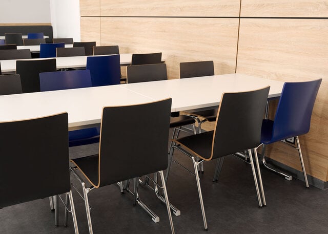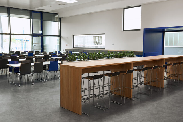 Das Kantinengebäude wurde größtenteils in Weiß und Grau gehalten, mit Akzenten in Sonoma Eiche und der Hausfarbe Blau. Diese Kombination schafft eine angenehme und helle Wohlfühlatmosphäre. In der Kantine wurden 175 Sitzplätze innen + 60 weitere Sitzplätze auf der großen, vorgelagerten Terrasse geschaffen. Der Raum dient auch als Veranstaltungssaal.