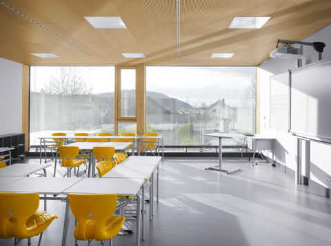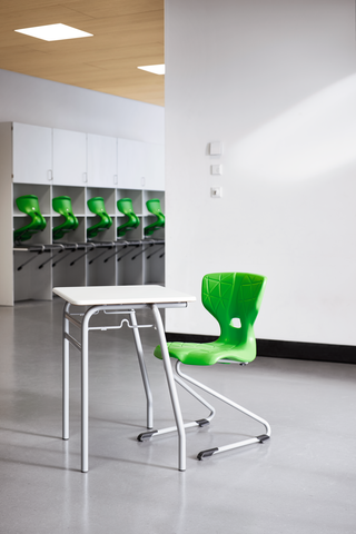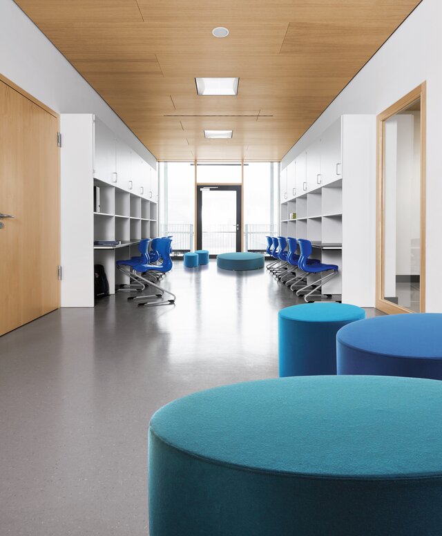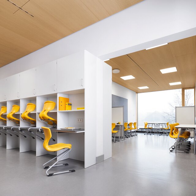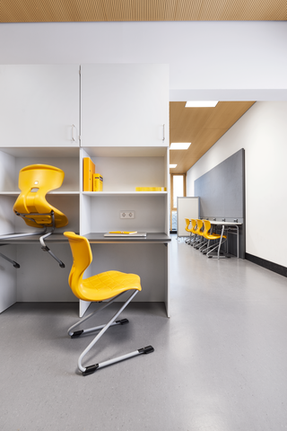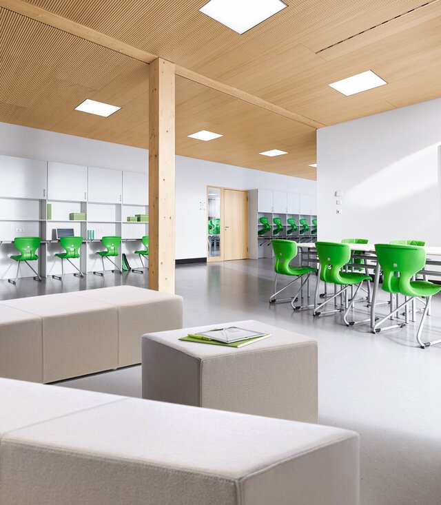 Die flexible Einrichtung erlaubt alle Lernformen vom klassischen Frontalunterricht über Lerngruppen bis zu stiller Einzelarbeit. Die Farbkodierung der verschiedenen Bereiche bietet Orientierung und unterstreicht die räumliche Struktur. Auf den Fluren kann sowohl selbstständig gelernt als auch in Gruppen an Projekten gearbeitet werden. Ob mit mobilen Stellwänden in kleinen, geschützten Selbstlernzentren oder durch das Clustern von Einzeltischen im größeren Gruppenbereich. Die flexiblen, stapelbaren Möbel ermöglichen schnelles und einfaches Umgestalten.