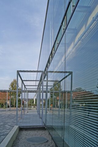Das Erscheinungsbild des funktional autarken Neubaus schließt an die bestehenden Schulgebäude an: Holzelementbauweise mit einer Glashaut als Klimapuffer und Fassadenschutz. Die Idee des flexiblen Lernens und der Inklusion erforderte das Aufbrechen klassischer Raumstrukturen. Neben Mensa, Mediathek, Fachräumen, Spindräumen, Lehrerarbeitsraum und sanitären Anlagen entstanden Klassenräume mit großzügigen, vorgelagerten und offenen Lernlandschaften für maximale Flexibilität.