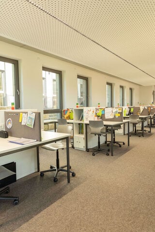 Ausdauerndes Lernen durch ergonomische Schülerstühle. Damit die Schülerinnen und Schüler gerne und lange fokussiert lernen, sitzen sie auf Gasfederdrehstühlen. Diese sind besonders ergonomisch: Jede und jeder kann sich die optimale Sitzhöhe einstellen und dank der flexiblen PAGHOLZ®-Sitzschale besonders bequem sitzen. Die Stühle sind so konfiguriert, dass sich die Sitzschale nicht dreht – und es im Lernatelier ruhig zugeht.