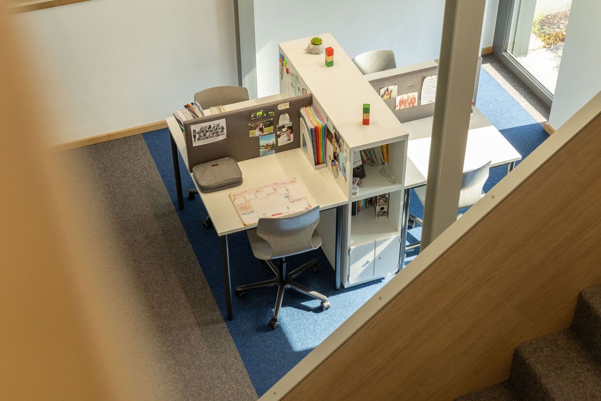 Das Ergebnis sind die sogenannten Lerninseln, die vier Lernplätze bieten. Eine Lerninsel besteht aus zwei Tischen, mit jeweils einem Schülerstuhl an der kurzen Kante und einer kleinen Trennwand in der Mitte – ähnlich wie bei einer Tischtennisplatte. An ihren langen Seiten sind die Tische über ein schmales Schrankmodul miteinander verbunden.