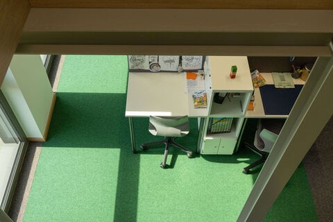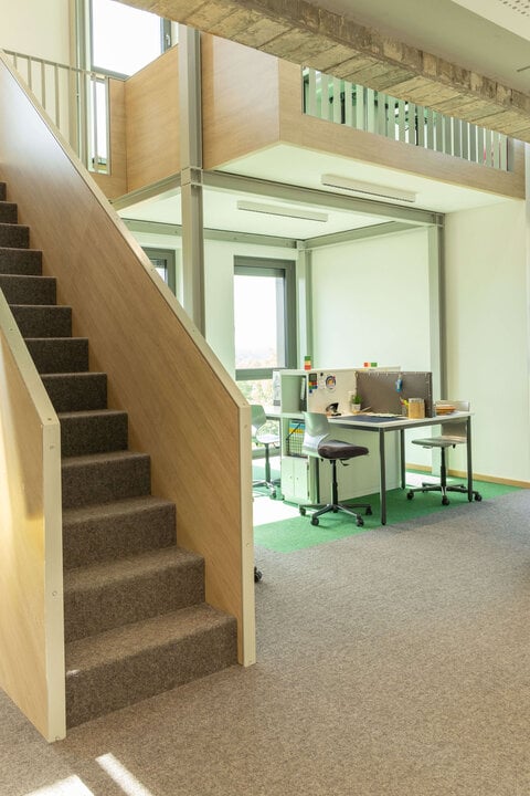 Das Lernatelier der fünften und sechsten Klasse wurde als großer, zweistöckiger Raum angelegt, in dem alle Schülerinnen und Schüler einen eigenen Arbeitsplatz bekommen sollten, um selbstständig ihren Lernaufgaben nachzugehen. Das Lernhaus der siebten und achten Klassen befindet sich im sogenannten Altbau und ist gleichwertig ausgestattet. Zusammen mit der Steinwaldschule fragten wir uns: Wie sieht ein Arbeitsplatz im Alt-oder auch Neubau aus, an dem Lernende gerne und konzentriert arbeiten – und der zugleich kompakt ist?