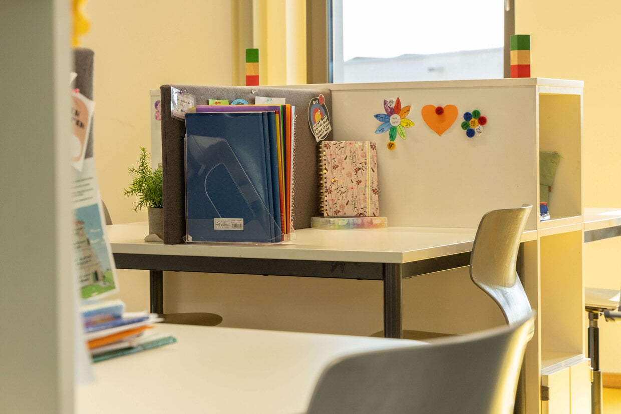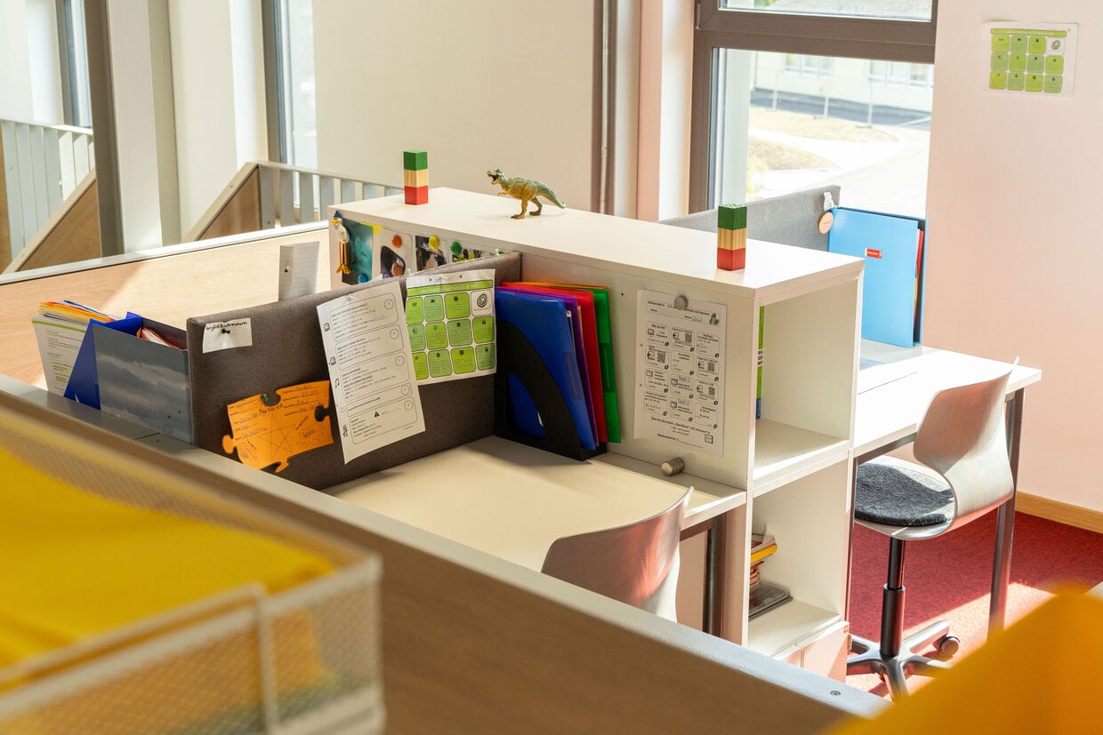 Persönliche Gestaltung des Lernplatzes. Damit sich die Schülerinnen und Schüler an ihrem Lernplatz wohlfühlen, können sie diesen selbst gestalten. Die bepinnbaren Trennwände und magnetischen Schrankseiten bilden eine Freifläche für Bilder, Notizen, Steckbriefe, Gebasteltes – alles, was sie motiviert, beglückt oder an ihre Stärken erinnert.