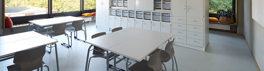 In Bildungseinrichtungen muss immer alles gut und sicher verstaut sein. Ideal, dass es unser ASS Schranksystem im EURO-Raster DIN 18000 vom Einzelstück über die Schrankwand bis zum Einbauschrank jeder Situation anpassen kann. So findet sich immer eine Lösung für die unterschiedlichsten Räume. Und Sie können sicher sein, dass Sie ASS Qualität aus Deutschland erwerben, die lange hält und alles mitmacht.